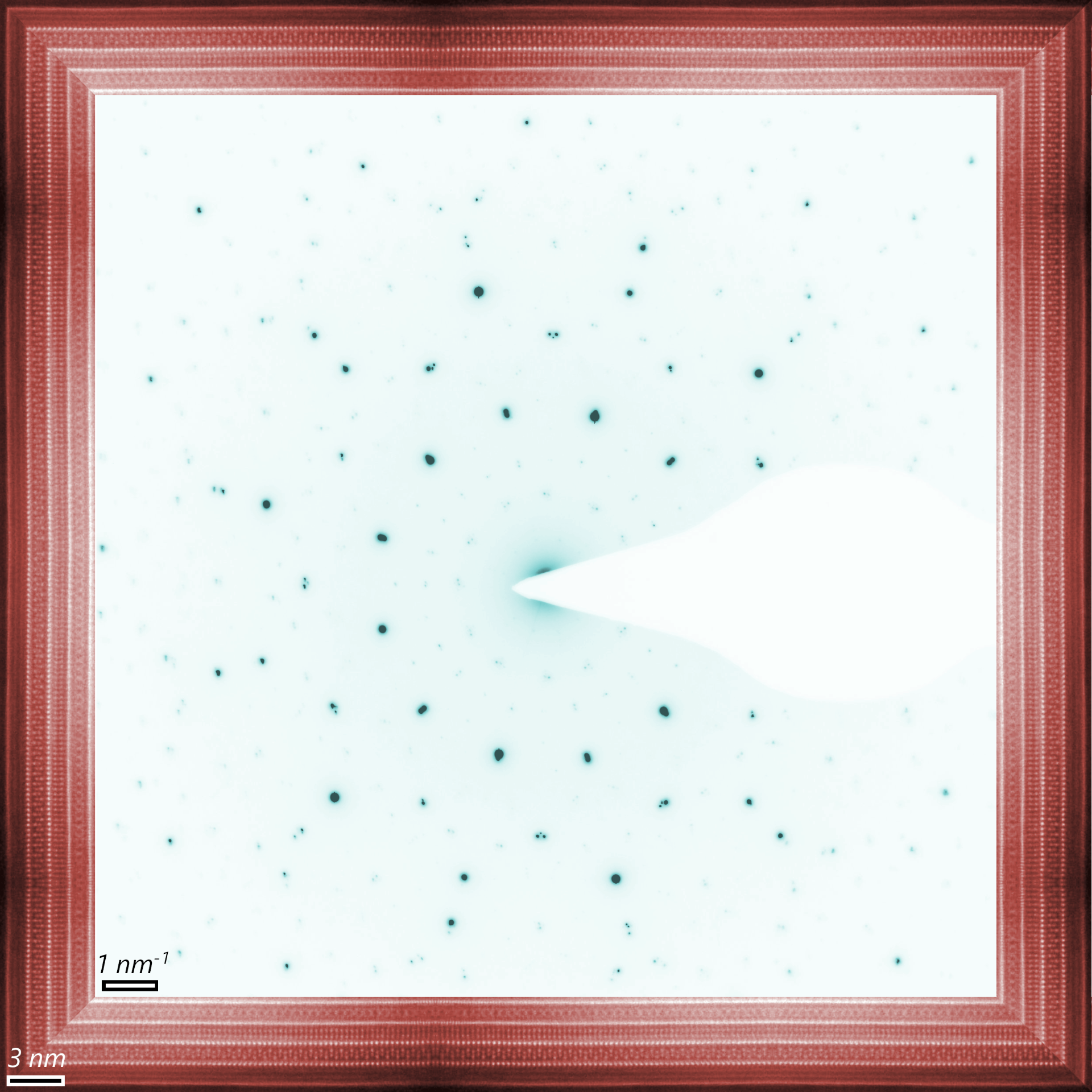Colored selected-area electron diffraction (SAED) pattern of a flake of the misfit layered compound (MLC) SmS-TaS2 framed by a high-resolution scanning transmission electron microscopy (HRSTEM) image taken from a nanotube made of the MLC LaS-TaS2. MLCs are made up of two slabs of different materials (e.g. TaS2 and SmS or LaS), which are stacked alternatively. Due to the lattice mismatch between the two subsystems, the compound is incommensurate. The two slabs are revealed in the HRSTEM image frame and the complex interplay between the hexagonal TaS2 and the (distorted) rocksalt lattice of SmS are reflected by the multitude of spots in the SAED pattern.